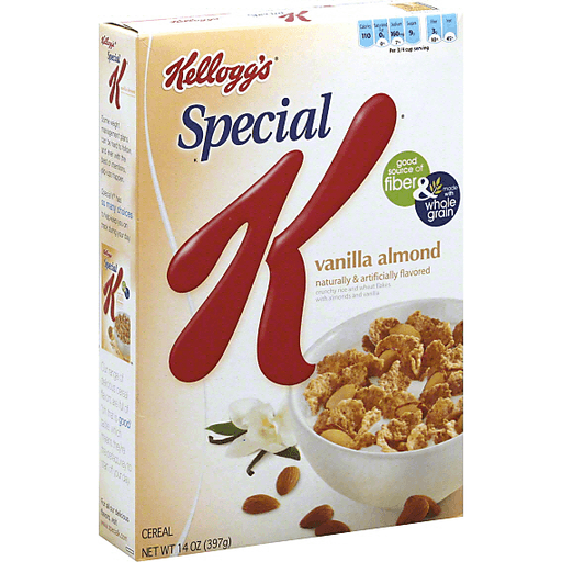 Crunchy rice and wheat flakes with almonds and vanilla. Naturally & artificially flavored. 110 calories; 0 g saturated fat (0%); 160 mg sodium (7%); 9 g sugars; 3 g fiber (10%); iron (45%) per 3/4 cup serving. Good source of fiber & made with whole grain. Some weight management plans can be hard to follow, and even with the best of intentions, slip-ups happen. Whole Grain 9 g or more per serving. Eat 48 g or more of whole grains daily. We all face moments in the day when it's hard to stay on track while managing our weight. The great news is there's a whole pantry full of delicious Special K products that help you mix-up your routine and feel great after eating them.