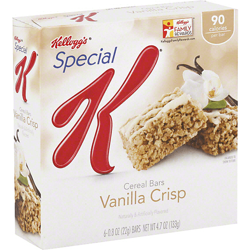 Naturally & artificially flavored. 90 calories per bar. Kellogg's Family Rewards. KelloggFamilyRewards.com. Earn rewards. Yes, I snack and so can you. A quick snack, like a Special K cereal bar, can give you a lift. Visit kelloggs.com.