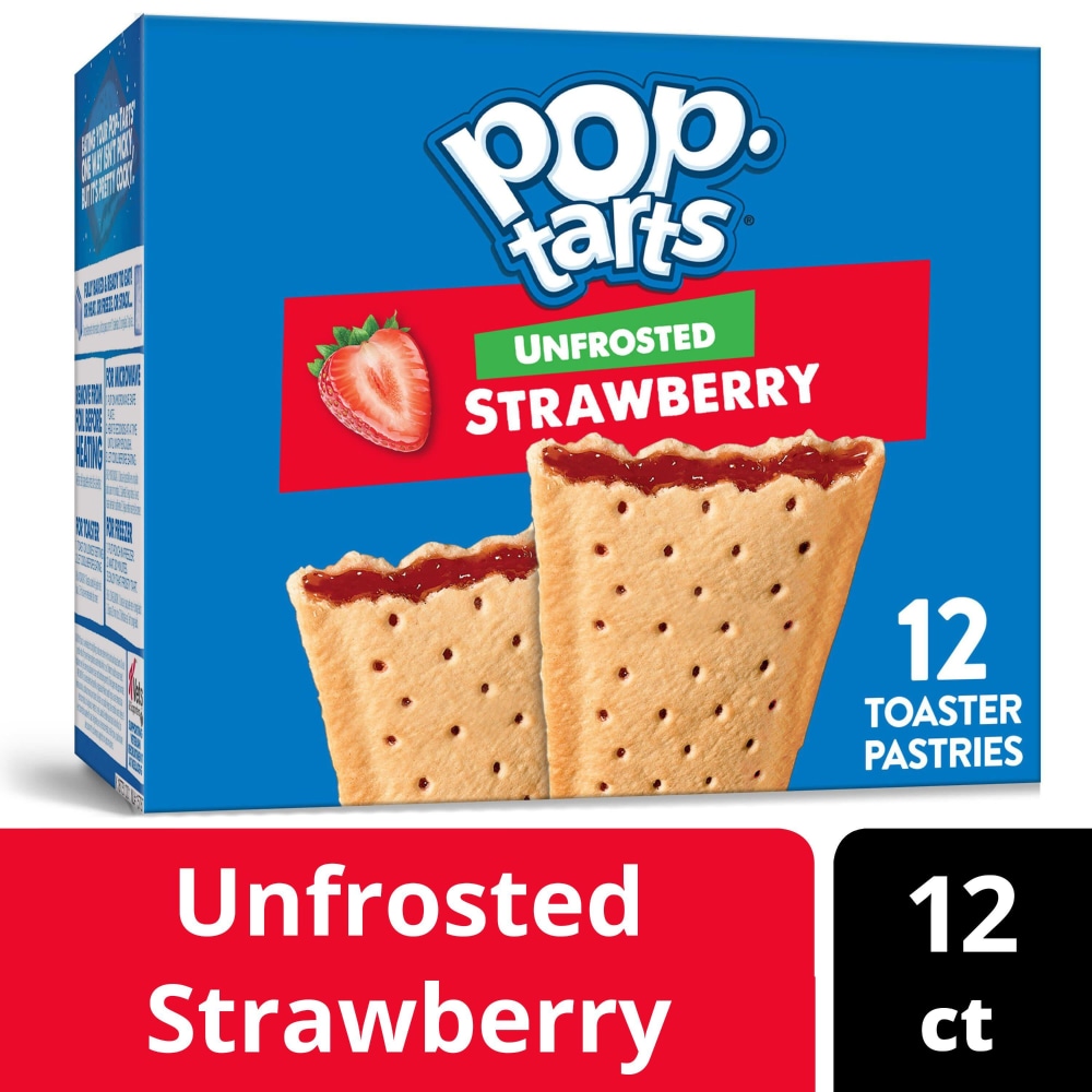 Pop-Tarts Unfrosted Strawberry toaster pastries are a delicious treat to look forward to any time of day. Includes one, 20.3-ounce box containing 12 Unfrosted Strawberry Pop-Tarts. Jump-start your day with a sweet and decadent blast of gooey, strawberry-flavored filling encased in a pastry crust. A quick and tasty anytime snack for the whole family, Pop-Tarts toaster pastries are an ideal companion for lunchboxes, after-school snacks, and busy, on-the-go moments; Not just for mornings, the versatile deliciousness of Pop-Tarts fits into your lifestyle just about anywhere there's time for a snack. Store them in your desk drawer for a pick-me-up at the office, keep them on hand in your pantry for a sweet after-dinner treat, or bring some in the car for a satisfying snack on the road. These toaster pastries also make welcome additions to care packages, goodie bags, and gift baskets for a pleasant surprise friends and family will be delighted to unwrap. Just pop them in your toaster for a crisp, warm crust, heat them in the microwave, or enjoy them straight out of the foil with a glass of ice-cold milk.