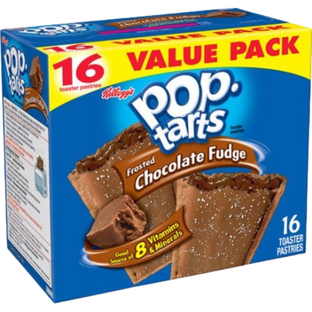 Pop-Tarts Frosted Chocolate Fudge toaster pastries are a delicious treat to look forward to any time of day. Jump-start your day with a sweet and decadent blast of gooey, chocolate fudge-flavored filling encased in a crumbly pastry crust. It makes a quick and tasty kids snack. Pop-Tarts toaster pastries are an ideal companion for lunchboxes, school snacks, and busy, on-the-go moments; Not just for mornings, the versatile deliciousness of Pop-Tarts fits into your lifestyle just about anywhere there's time for a snack. Store them in your desk drawer for a pick-me-up at the office, keep them on hand in your pantry for a sweet after-dinner treat, or even bring some in the car for a breakfast to go. Just pop them in your toaster for a crisp, warm crust, heat them in the microwave, or enjoy them right out of the foil with a glass of ice-cold milk. CONTAINS WHEAT, MILK, SOY AND EGG.