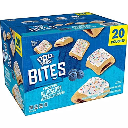 Includes 1-28-ounce box containing 20, 1.4-ounce pouches of Pop-Tarts Bites. Bite-sized Pop-Tarts with delicious blueberry-flavored filling; Topped with sweet frosting and crunchy sprinkles. A mini, poppable take on your favorite Pop-Tarts Toaster Pastries; Great for breakfast and snacking on-the-go. Contains wheat and soy ingredients; Kosher Dairy. A travel-ready food; Makes for tasty snacks wherever you need it; Fully baked mini Pop-Tarts Bites that are ready to eat.