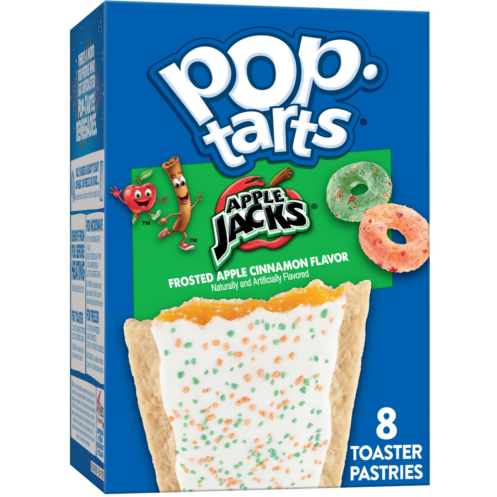 A combination of your favorite Kellogg's breakfast treats, Pop-Tarts Apple Jacks Frosted Apple Cinnamon Flavor Toaster Pastries make a delicious snack to look forward to any time of day. Jump start your day with a sweet and decadent blast of gooey Apple Jacks-inspired apple cinnamon-flavored filling encased in a pastry crust, topped with yummy frosting and crunchy sprinkles. They’re a quick anytime snack for the whole family; Pop-Tarts Toaster Pastries are an ideal companion for lunchboxes, after-school snacks, and busy, on-the-go moments. Not just for mornings, the versatile deliciousness of Pop-Tarts fits into your lifestyle just about anywhere there's time for a snack. Store them in your desk drawer for a pick-me-up at the office, keep them on hand in your pantry, or in the car for a delicious snack on the road. Just pop them in your toaster for a crisp, warm crust, heat them in the microwave, or enjoy them straight out of the foil with a glass of ice-cold milk.