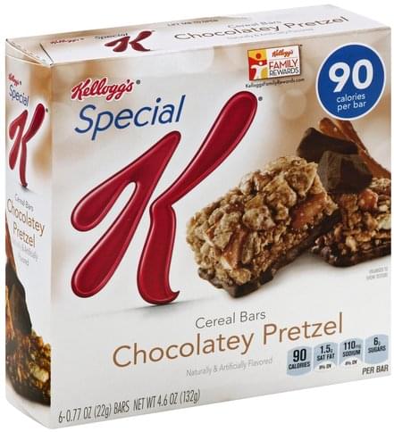 Kellogg's® Special K® Chocolatey Pretzel Cereal Bars. 90 calories per bar. Naturally & artificially flavored. 6 - 0.77 oz (22g) bars. Per bar: 90 calories. 1.5g sat fat, 8% DV. 115mg sodium, 5% DV. 6g sugars. Also try. Kellogg's Special K pastry crisps. A little sweetness for your day. Kellogg's Special K protein chewy granola bars. A satisfyingly delicious snack with 4g protein and 4g fiber. Contains 3g total fat per serving. If you enjoy chocolatey pretzel cereal bars: We invite you to try: Salted pretzel chocolate snack bars. Made with crunchy pretzel bits and delectable chocolatey chunks, these chewy-with-a-hint-of-crisp bars are crafted with wholesome ingredients that taste as delicious as they look. Please recycle. kelloggs.com/ourfuture. Certified 100% Recycled Paperboard®. how2recycle.info. Questions or comments Visit kelloggs.com. Call 1-800-962-1413. Provide production code on package. ®, TM, ©2015 Kellogg NA Co.