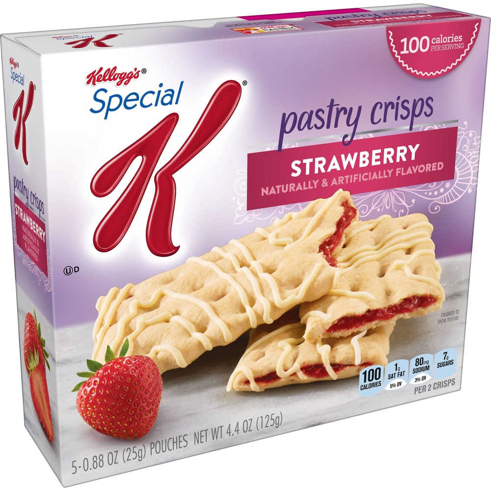 Enjoy the freedom to snack deliciously with guilt-free Special K Strawberry Pastry Crisps. Includes 1, 4.4-ounce box with 5, 100-calorie pouches ready to satisfy sweet cravings on the go. A balance of crumbly crust, icing drizzle and gooey center bursting with strawberry flavor provides a simple, feel-good snack experience in every bite. With 7g sugar (2g sugar alcohol) per 2-bar serving, you can say yes to treating yourself and no to compromising on flavor; keep Pastry Crisps in your pantry, desk or car for a quick afternoon pick-me-up or rewarding anytime treat. Stash a portable pouch in any purse, work tote, backpack or fitness bag to delight your sweet tooth throughout the day. Go big on taste with 100 calories by adding the joy of Kellogg's Special K Strawberry Pastry Crisps to your regular snack routine.