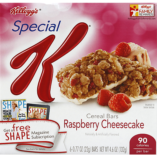 Kellogg's® Special K® Raspberry Cheesecake Cereal Bars. 90 calories per bar. Good source of fiber. 2g fat per serving. Naturally & artificially flavored. You could win a $2,500 shopping spree in New York! Drop a jean size in 2 weeks!† As part of the Special K Challange™. 6 0.77 oz (22g).