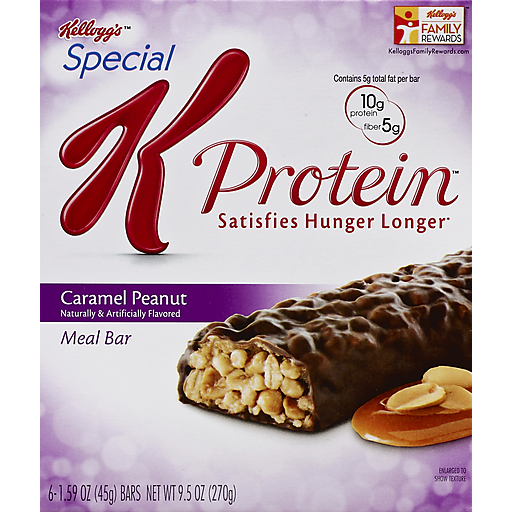 Naturally & artificially flavored. Satisfies hunger longer. Contains 5 g total fat per bar. 10 g protein. 5 g fiber. The protein effect Special K. Special K Protein meal bars offer so many delicious ways to stand your ground - each with 10 g of protein plus fiber to help you satisfy hunger longer.