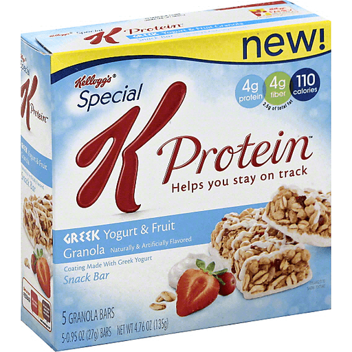5 granola bars. Naturally & artificially flavored. Coating made with Greek yogurt. 4 g protein. 4 g fiber. 110 calories. 2.5 g of total fat. Helps you stay on track. New! Kellogg's family rewards. Earn rewards. It's easy! 1. Find code inside package. 2. Enter code at KelloggsFamilyRewards.com. 3. Collect & redeem points for family rewards. Visit KelloggsFamilyRewards.com. The protein effect - Special K. Beautifully blended wholesome goodness and taste! Our new granola snack bar gives you 4 g fiber, 4 g protein and 110 sensible calories in a delicious mix of hearty oats, tangy-sweet berries and Greek yogurt. We've got you covered. Learn more at SpecialK.com/proteineffect. Good source of protein, 10% daily value or more per 1-1/2 bars. Give us your feedback. Tell us what you think. Talk to us. And learn more about other new products. newfromkelloggs.com.