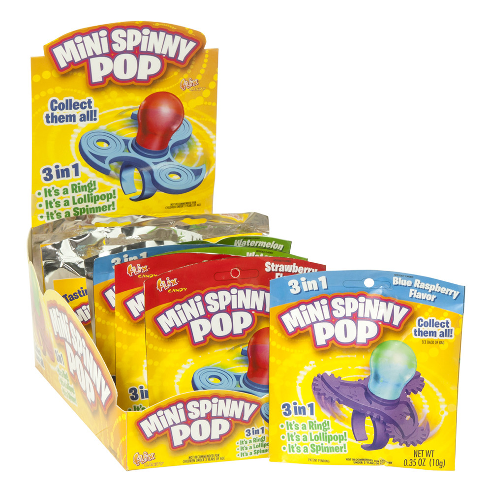 Mini Spinny Pop 3 in 1 It s a ring it s a Lollipop and it s a spinner. Collect them all. Styles and flavors vary.