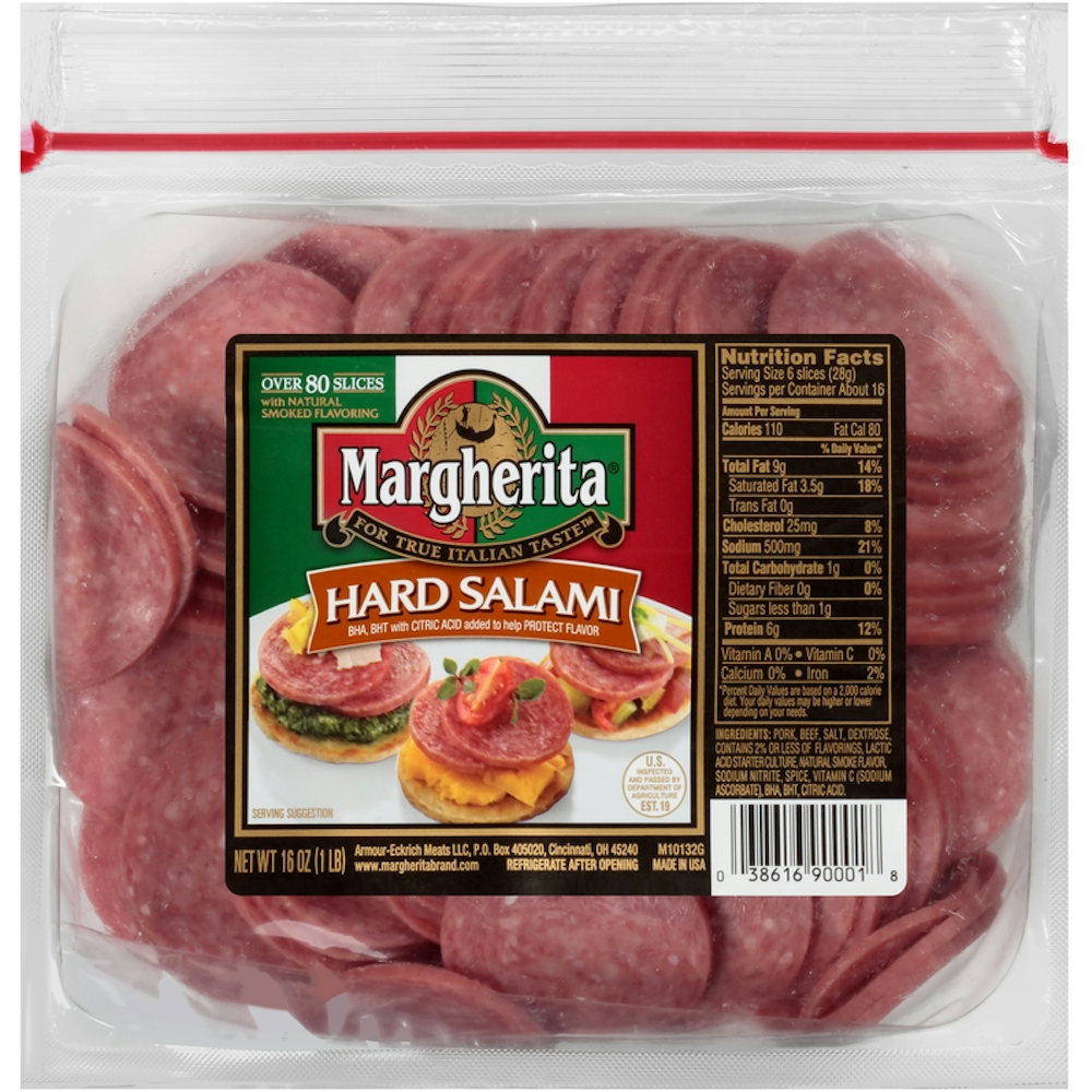 Margherita Sliced Hard Salami comes ready to eat in small, versatile slices for quick snacks or additions to your favorite recipes. Made from the finest cuts of pork and beef, this sliced hard salami delivers true Italian taste to your meals and snacks. This salami lunch meat is smoked to perfection for a natural, robust smokiness that everyone can enjoy. Margherita hard salami is pre-sliced into consistently thin pieces that work in many different dishes without any prep work to save you time. Add hard salami slices to your favorite Italian sub sandwich to boost flavor, or chop them up and add to breakfast frittatas for an Italian twist on a morning classic. Eat them straight from the package for a quick snack, or stack salami and cheese on crackers with veggies or spreads for party appetizers or as part of a charcuterie board. The resealable pouch keeps the pre sliced salami fresh in your refrigerator after opening. For true Italian taste, choose Margherita.