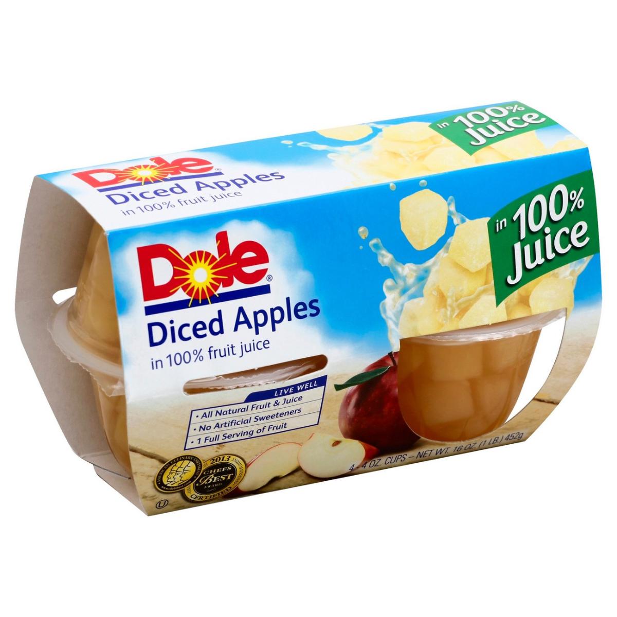 - The manufacturer of 100% Juice, Diced Apples is Dole.