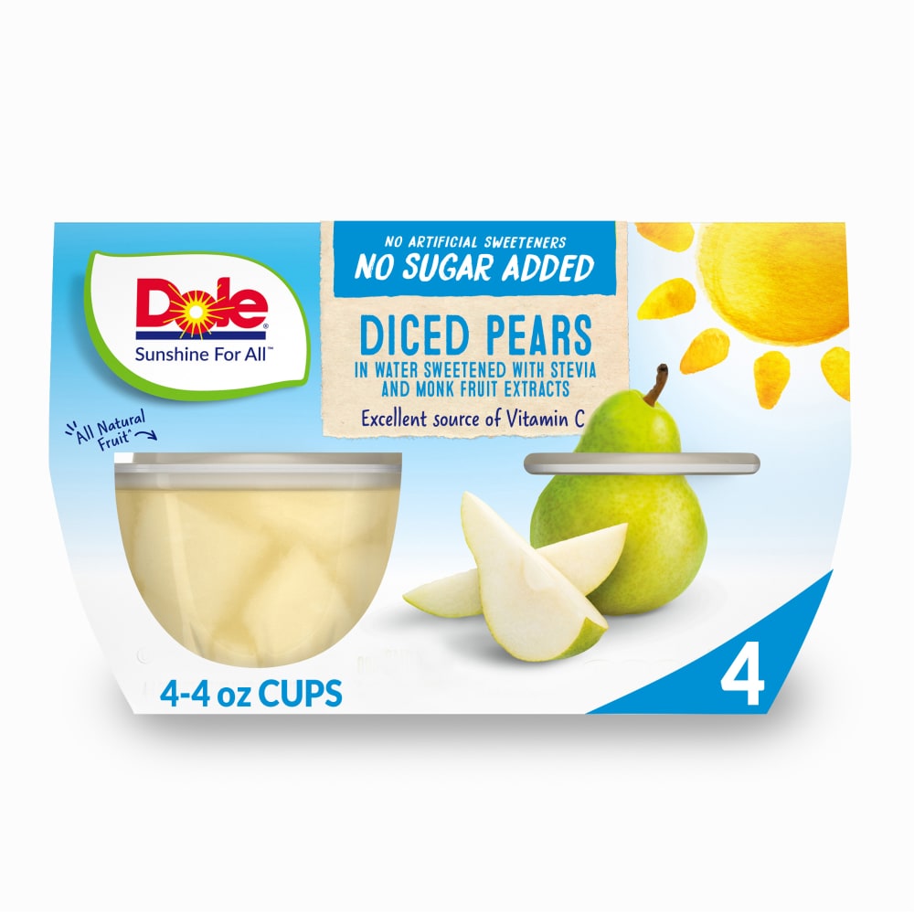 - The manufacturer of No Sugar Added Diced Pears in Water Sweetened with Stevia Extract, Water is Dole.