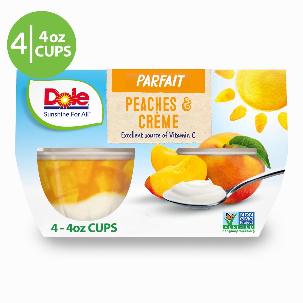 Light-tasting crème with juicy peach slices! Dole Peaches and Crème Parfait Fruit Bowls combine a smooth layer of light-tasting crème with juicy peach slices for a delightfully satisfying snack in a convenient plastic bowl. The slices of peach pair perfectly with the sweet cream. Rich in Vitamin C each of the 4 Dole Peaches and Crème Parfait Fruit Bowls are made with the nutritional goodness of real fruit making them the ideal snack for breakfast lunch or dessert - any time you re craving a sweet treat. With Dole s portable snacks you can have the delicious taste of fruit anywhere anytime.