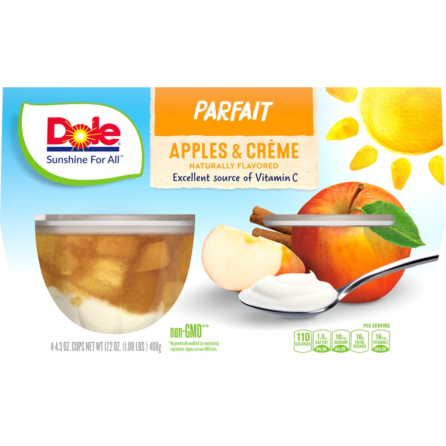Reward your sweet cravings with the perfect heavenly treat. A cool, smooth layer of light-tasting creme comes together with crisp, diced apple for a delightfully satisfying snack. DOLE Apple & Creme Parfait is made with nutritional goodness of real fruit, so it's rich in Vitamin C and low in fat. Indulge in a blissful blend of the fruit you love and a smooth layer of sweet, delicate Creme. It's heaven in a cup.