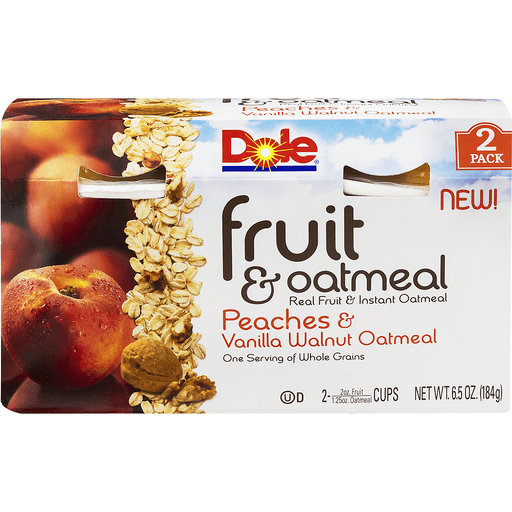 Dole Fruit & Oatmeal Peaches & Vanilla Walnut Oatmeal. New! Real fruit & instant oatmeal. One serving of whole grains. Taste the delicious difference of real fruit! Introducing sun-ripened Dole all natural fruit in whole grain oatmeal. It's a healthy, satisfying breakfast you can enjoy anywhere. Dole. Make Every Day Shine. Excellent source of fiber & vitamin C. 21g of whole grain oats per serving. No trans fat or cholesterol. Fast & easy! Just add hot water or microwave. Try our other delicious flavors:. Apples and brown sugar oatmeal. Blueberries and cream oatmeal. For more than 100 years, Dole has been committed to our environment, our employees and the communities in which we operate. To learn how, please visit www.dolecrs.com.
