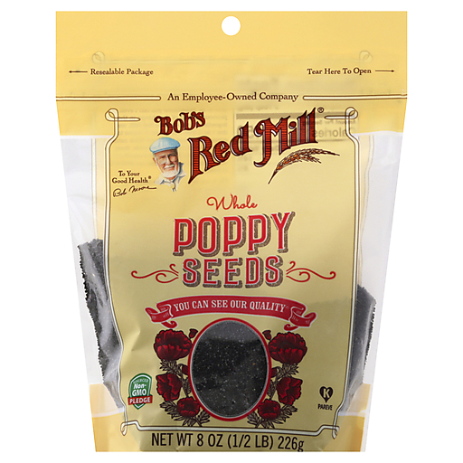 Poppy seeds are a great source of calcium and contain 6 grams of protein per serving. Sourced Non-GMO pledge. For more information on our sourced Non-GMO pledge, visit bobsredmill.com/non-gmo. An employee-owned company. To your good health. -Bob Moore. You can see our quality. Dear friends, Nowadays, so many of the products you find in grocery stores are processed to the point that they can barely be considered food at all. Sometimes you can't even pronounce half of the things in the ingredients list! At Bob's Red Mill, we don't do it that way. When it comes to grains, beans and seeds, we think nature got it right. In their original state, these wholesome foods provide a magnificent combination of nutrients that are essential to health. We honor this innate perfection by keeping our foods simple, and our poppy seeds are an excellent example of that practice. They are simply seeds from the poppy plant - nothing added or removed. It doesn't get much simpler than that. And we think that's just how it should be. To your good health, Bob Moore. bobsredmill.com. For information and recipes, visit bobsredmill.com. Resealable package.