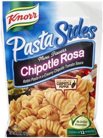 Menu flavors. Rotini pasta in a creamy chipotle tomato sauce. Made with real chipotle pepper. No artificial preservatives. Cook in 12 minutes. No artificial flavors. No artificial colors. For complete nutrition information and great recipe ideas, visit letsmakeknorr.com. Like us at facebook/Knorr.