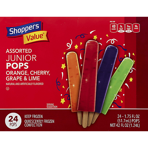 - The manufacturer of Assorted Junior Pops, Orange, Cherry, Grape & Lime is Shoppers Value.