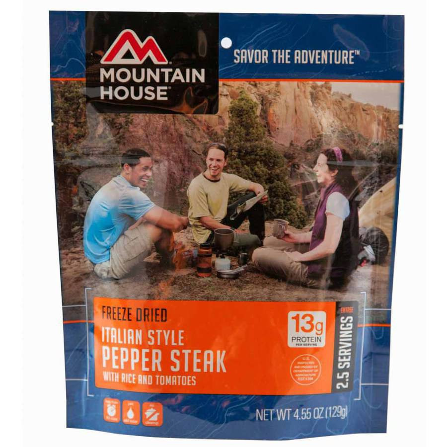 Product Info for Mountain House Italian Style Pepper Steak with Rice and Tomatoes - Pouch The Mountain House Freeze-Dried Italian-Style Pepper Steak with Rice and Tomatoes Pouch is great for bringing along on hikes, camping and other outdoor activities. The freeze-dried recipe is made with tender cuts of steak, long grain rice, red, green and yellow bell peppers, onions and tomatoes. Simply add water to prepare directly in the pouch. Durable and lightweight pouch contains 2.5 servings. 13 grams of protein per serving.One thing that makes this meal so great is the fact the pouch it comes in is your bowl and, once you're done with your meal, trash recepticle all-in-one. Just add the specified amount boiling water, zip lock it closed, let it stand for the required amount of time, then serve. Once you are done with your meal, clean up is easy. No more dishes, just zip it shut and you're all set.