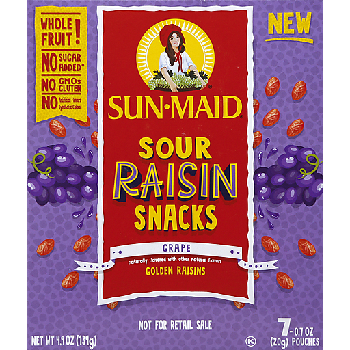 - The manufacturer of Grape Sour Golden Raisin Snacks, Grape is Sun-Maid.