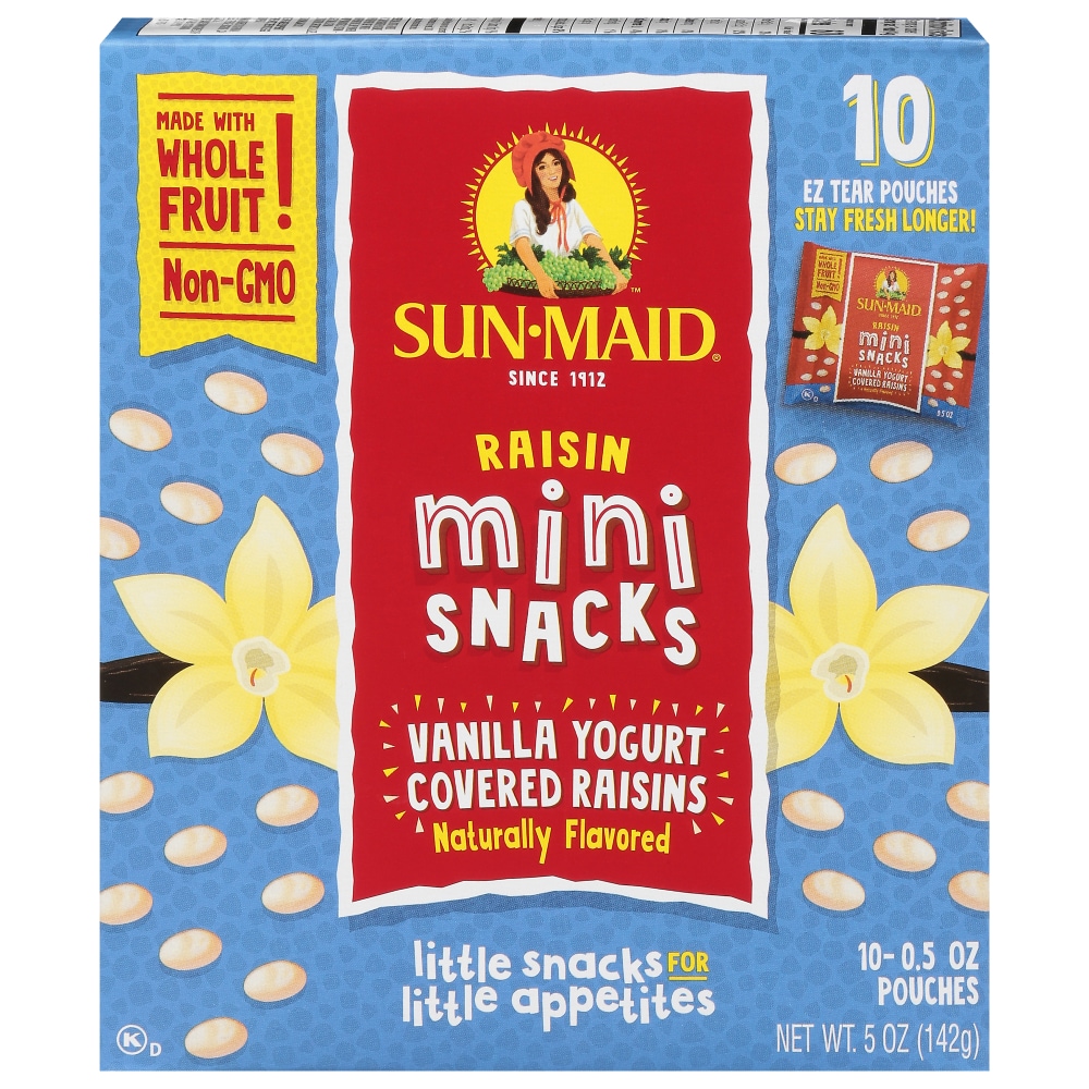 Little Snacks For Little Appetites. Remember Childhood? And your favorite childhood snack? Well, the wholesome goodness of Sun-Maid raisins just got a little bit sweeter. Our California Raisins are wrapped in vanilla yogurt. Easy to enjoy on-the-go, they're the perfect snack to throw in your bag or your kid's lunchbox. They're as timeless, tasty and trusted as the original Sun-Maid raisins.