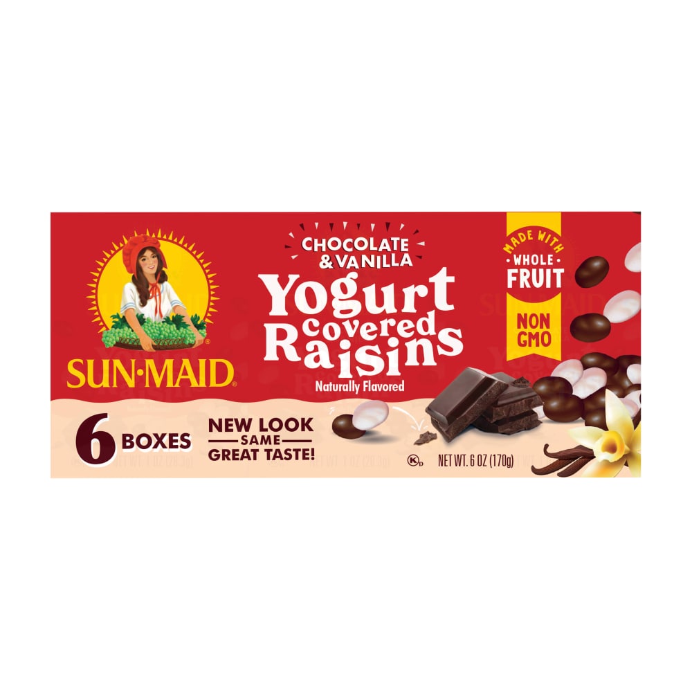 Sun-Maid® Chocolate & Vanilla Yogurt Covered Raisins - Kids crave, moms approve, made with whole fruit. Give your taste buds options with the delectable duo of chocolate and vanilla yogurt. A better for you, on-the-go snack that’s delectably indecisive. Sweet and creamy without the guilt of candy. Sun-Maid® is the timeless and trusted go-to snack that's simple, versatile and better-for-you. Make Sun-Maid® Chocolate & Vanilla Yogurt Covered Raisins a part of your daily routine, at home or on the go. Made with Whole FruitNon-GMONaturally FlavoredOK Kosher - DairyStore in Dry & Ambient TemperaturesReady to Eat - Enjoy Right Out of the Package!