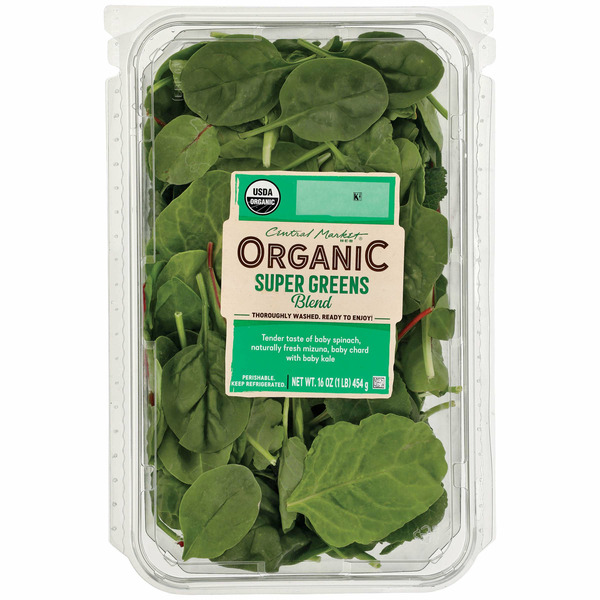 Thoroughly washed and ready to enjoy, Central Market Super Greens Blend is made up of organic baby spinach, baby mizuna, baby chard and baby kale. Mix these leafy greens into a bowl to create a gourmet-quality salad in minutes.