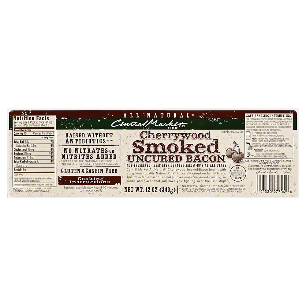 Central Market all natural* cherrywood smoked uncured bacon begins with exceptional quality natural pork* humanely raised on family farms. This delectable bacon is smoked over real cherrywood creating an aroma and flavor that will have you fighting over the last strip!