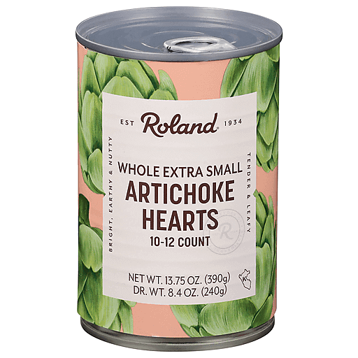 Roland® Whole Artichoke Hearts Medium. Est. 1934. 10-12 Count. Net Wt. 13.75 oz. (390 g).