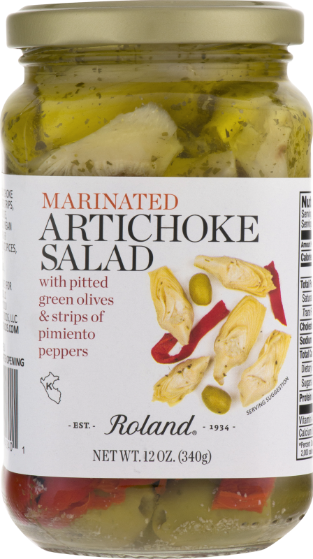 Roland® Marinated Artichoke Salad. With pitted green olives & strips of pimiento peppers. EST 1934.