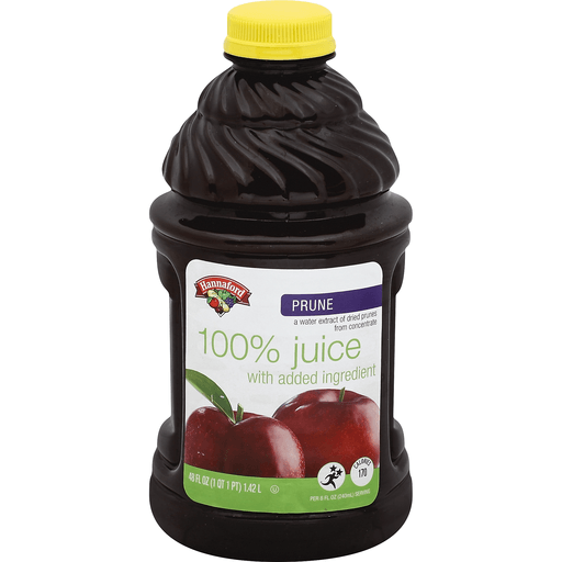 A water extract of dried prunes from concentrate. With added ingredient. 170 calories per 8 fl oz (240 ml) serving. Contains 100% juice. hannaford.com. Double money back guarantee. Pasteurized. Contains concentrate from USA/France/Chile. Bottled in USA.