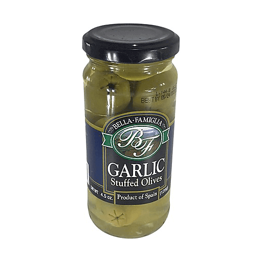 - The manufacturer of Garlic Stuffed Olives is Bella Famiglia.