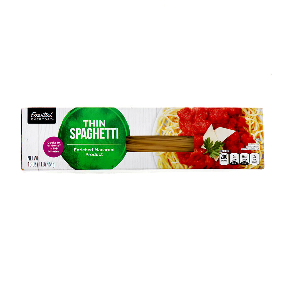 Essential Everyday Spaghetti ThinSEMOLINA (WHEAT), NIACIN, FERROUS SULFATE (IRON), THIAMIN MONONITRATE, RIBOFLAVIN, FOLIC ACID.