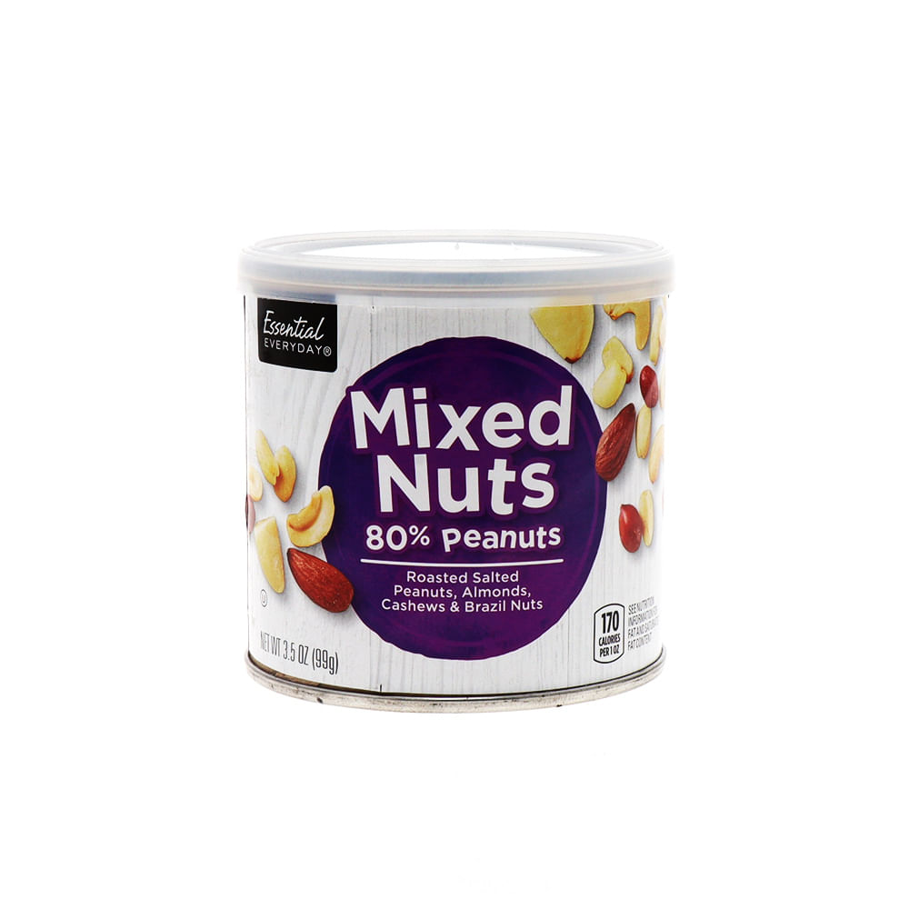 Roasted salted peanuts, almonds, cashews & Brazil nuts. 170 calories per 1 oz. See nutrition information for fat and saturated fat content. Contains bioengineered food ingredients. Like it or let us make it right. That's our quality promise. essentialeveryday.com. Packed in USA.
