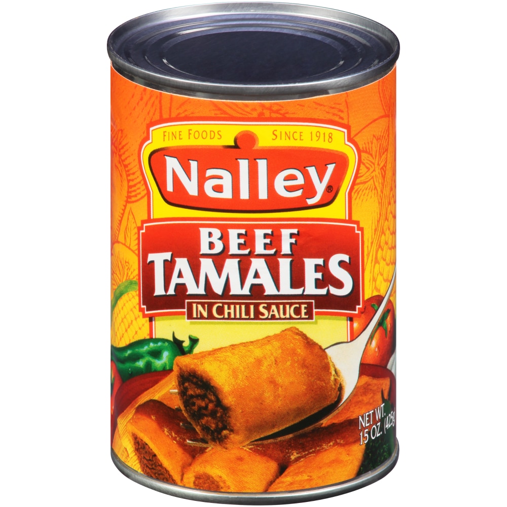 Fine foods since 1918. Nalley Beef Tamales are traditional Mexican tamales with a blanket of stone-ground corn masa surrounding a spicy, meat-filled center, and covered with chili sauce. Each tamale is individually wrapped in parchment to hold its shape. Eat them straight or try them in a casserole with rice and cheese. US inspected and passed by Department of Agriculture.