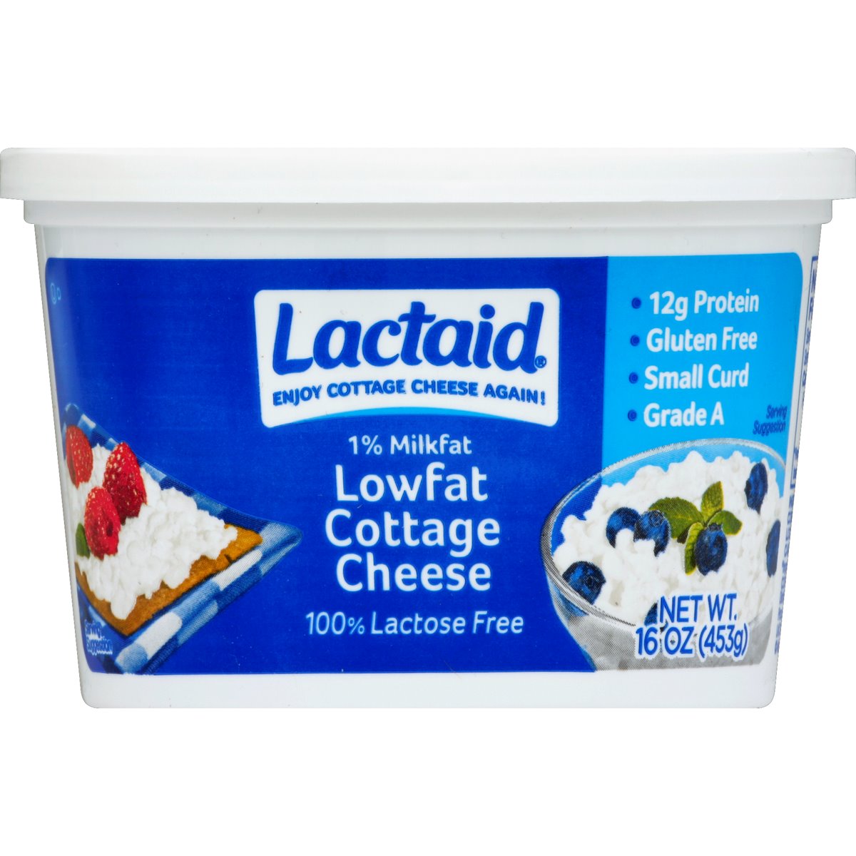 100% lactose free. Enjoy cottage cheese again! 12 g protein. Gluten free. Grade A. Real cottage cheese. No discomfort. Lactaid cottage cheese is delicious and nutritious! You'll love the creamy taste and the protein will help keep you satisfied. Best of all, it's lactose free so it's easy on your stomach. Enjoy cottage cheese again! Questions? Comments? Call 1-800-Lactaid (1-800-522-8243) or visit lactaid.com for information and recipe suggestions.