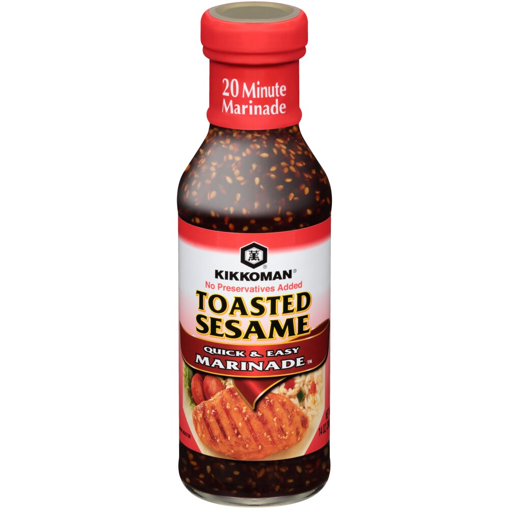 Kikkoman® Quick & Easy Marinade™ Toasted Sesame. 20 Minute marinade. Preservative free. Net wt 14 oz (396g). Quick & easy marinade - toasted sesame. Visit us at www.kikkomanusa.com. Partially produced with genetic engineering. Kikkoman is a registered trademark of Kikkoman Corporation.