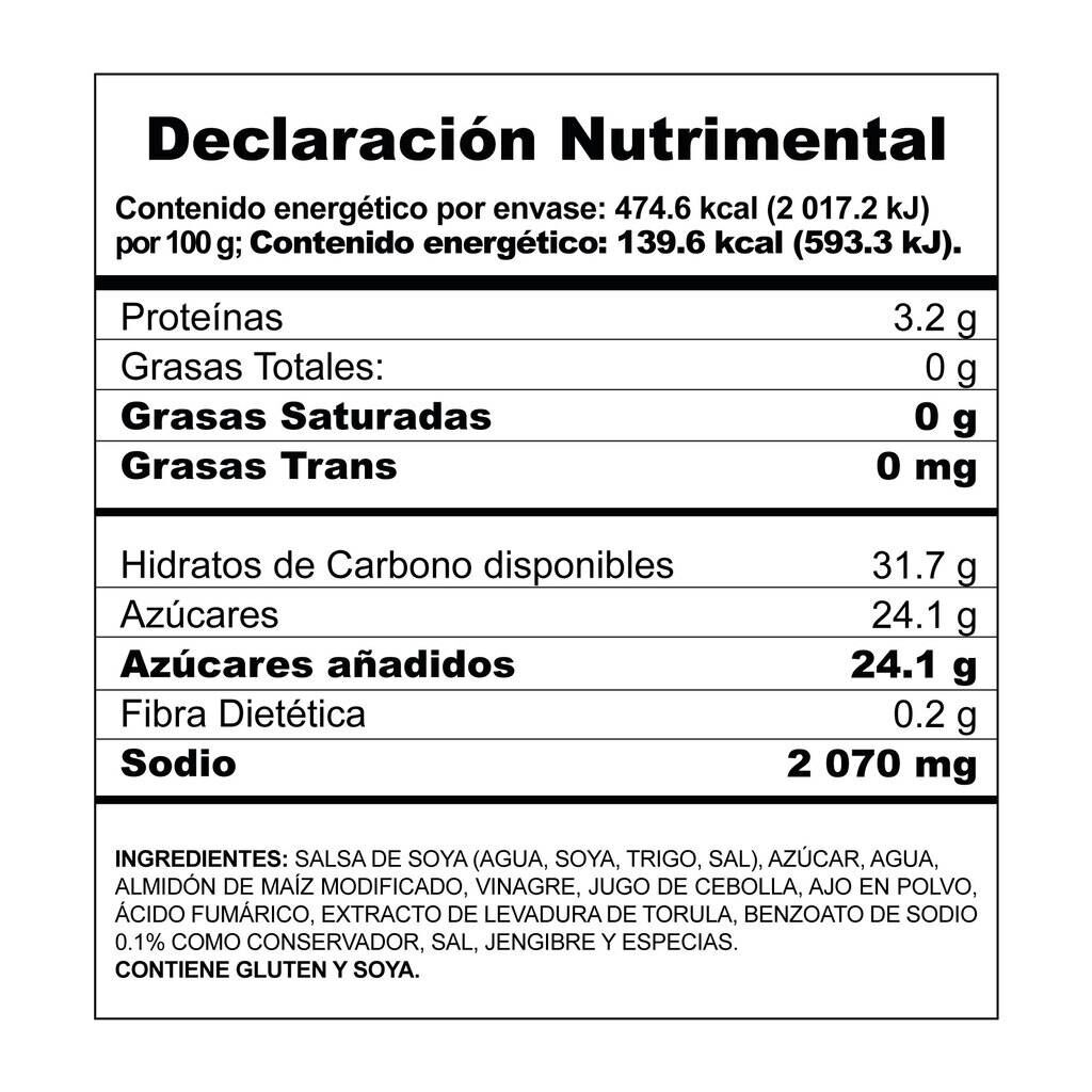 Water, Apples, Sugar, Vinegar, Soy Sauce (Water, Soybeans, Wheat, Salt), Salt, Modified Corn Starch, Onion, Tomato Paste, Caramel Color, Spices, Carrot, Garlic Powder, Maltodextrin, Sodium Benzoate as a Preservative.