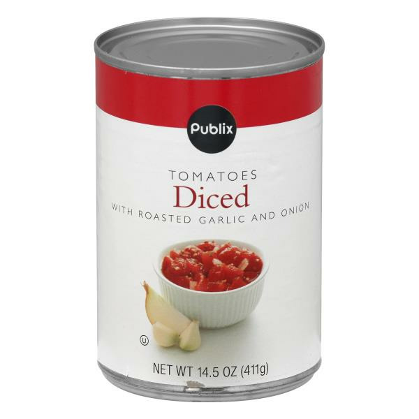 - The manufacturer of Tomatoes Diced with Roasted Garlic and Onion is Publix.