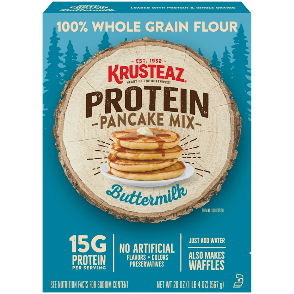 Here's a stack of pancakes that will fill you up without slowing you down. Made with 15 grams of protein per serving and 100% whole grain flour, Krusteaz Protein Pancake Mix means a breakfast, brunch or dinner packed with extra energy. And it's simple to make. Just add water to the mix and cook until your pancakes are golden brown. Each order includes eight, 20 ounce boxes.
