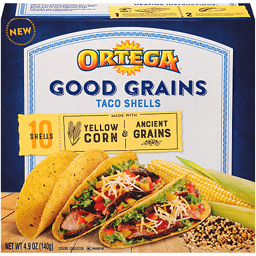 Made with yellow corn & ancient grains. New. Ortega Good Grains Taco Shells bring a distinct blend of flavors and goodness to your Mexican meal. Fill with your favorite toppings for a unique taco experience. www.ortega.com. Twitter. Facebook. For more Ortega family recipes visit us at www.ortega.com. Questions or comments? visit www.ortega.com. Try all of our Ortega good grains taco shells! Whole grain corn & lentil. Yellow corn & Ancient grains. White corn & chia seeds. Blue corn. Ortega® Good Grains Taco Shells bring a distinct blend of flavors and goodness to your Mexican meal. Fill with your favorite toppings for a unique taco experience.