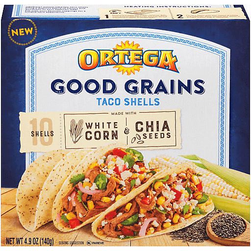 New. Ortega Good Grains Taco Shells bring a distinct blend of flavors and goodness to your Mexican meal. Fill with your favorite toppings for a unique taco experience. www.ortega.com. Twitter. Facebook. Question or comments? Visit www.ortega.com. Try all of our good grains taco shells! Whole grain corn & lentil. Yellow corn & ancient grains. White corn & chia seeds. Blue corn.