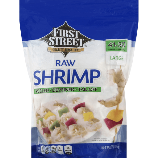- The manufacturer of Peeled, Deveined with Tail Off Large Raw Shrimp is First Street.
