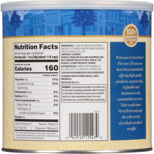 - The manufacturer of Cashews Halves & Pieces is First Street.
