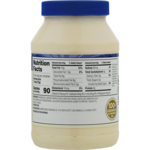Soybean Oil, Water, Whole Eggs and Egg Yolks, Distilled Vinegar, Salt, Sugar, Lemon Juice Concentrate, Calcium Disodium Edta (Used to Protect Quality), Natural Flavors.
