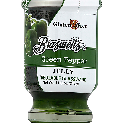 Gluten free. Reusable glassware (Remove shrink sleeve, reuse glassware!). Quite possibly the perfect party condiment, our emerald hued Green Pepper Jelly combines the savory flavor of green bell peppers and pure cane sugar. Traditionally served over cream cheese and served with crackers, it is also wonderful when added as a secret ingredient to your favorite lamb, pork or fresh vegetable recipes. For recipes and more www.braswells.com. Product of USA.
