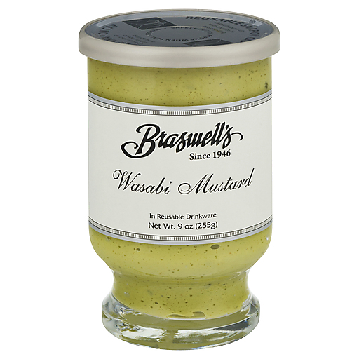 Wasabi mustard in reusable drinkware. Since 1946. www.braswells.com. Reusable snap on cap. Product of USA.