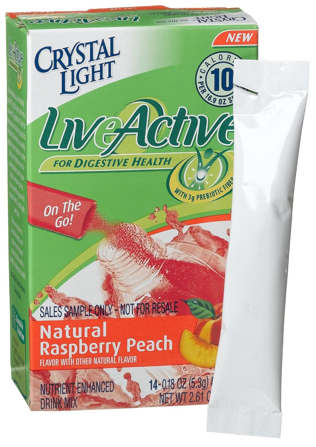 Crystal light live active on the go raspberry peach, 14-count packets (pack of 6) is a nutrient enhanced drink mix. Contains 10 calories per serving. Just add 16.9 oz water.