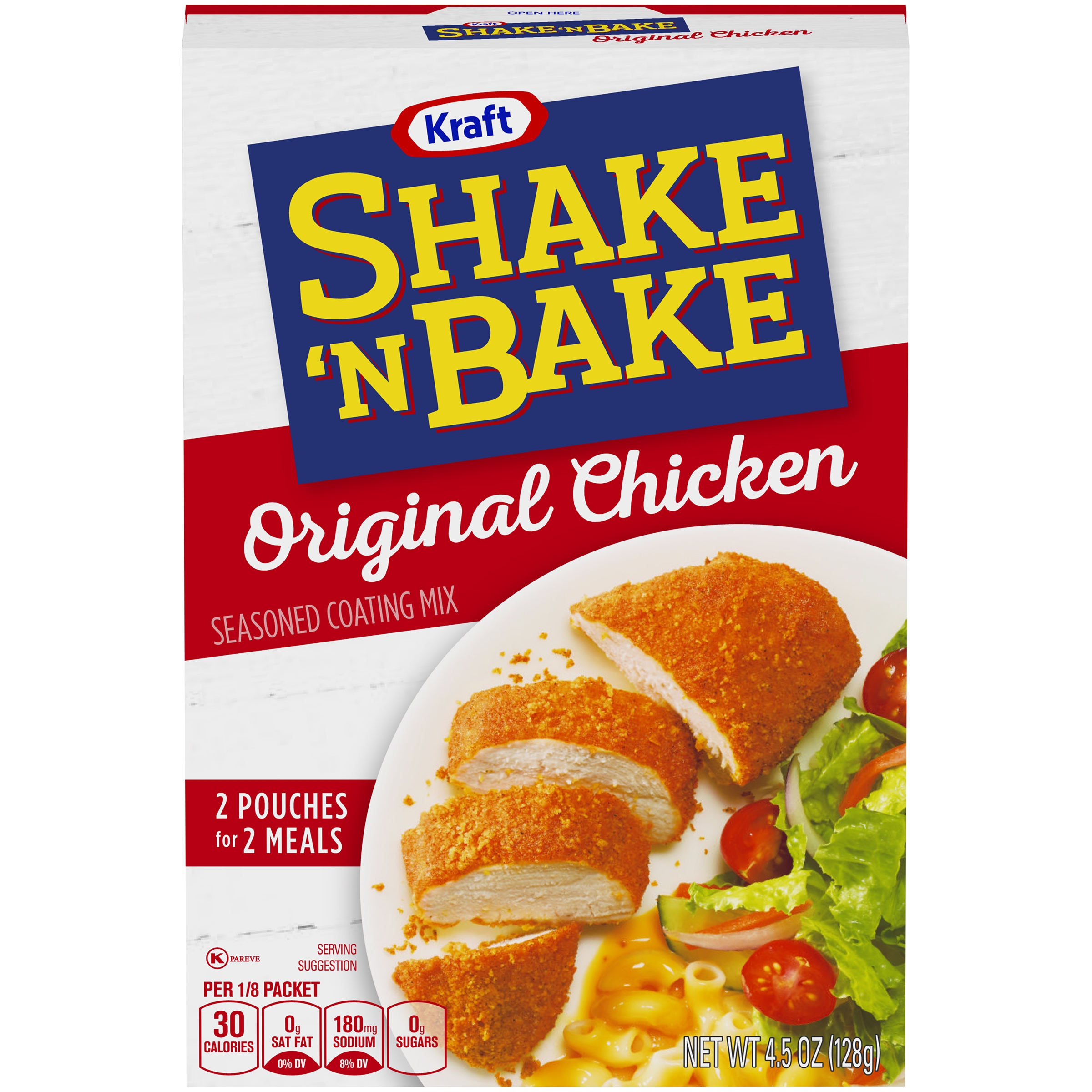 Shake up dinnertime with a family favorite. Shake 'N Bake Original Chicken Seasoned Coating Mix is the start of some amazing home-cooked meals. Featuring a blend of herbs, spices and bread crumbs, our seasoned coating mix creates crispy, flavorful and juicy chicken without frying. Easily add a layer of crunch to bone-in or boneless chicken, or try Shake 'N Bake with pork, vegetables and more. To prepare, simply moisten the chicken with water or egg, shake your food in a reusable container filled with Shake 'N Bake to coat it and bake until it's fully cooked. You can also try cooking your protein or veggies in an air fryer or skillet. For even more dinner ideas, check out the back of our box for three delicious recipes, including Crispy Baked Chicken, Crispy Chicken Sandwiches and Easy Chicken Nuggets. With a taste beloved by generations, Shake โN Bake is a dinner staple that kids love to help make. Each 4.5 ounce box comes with two pouches to make a delicious addition to two meals your entire family will enjoy.