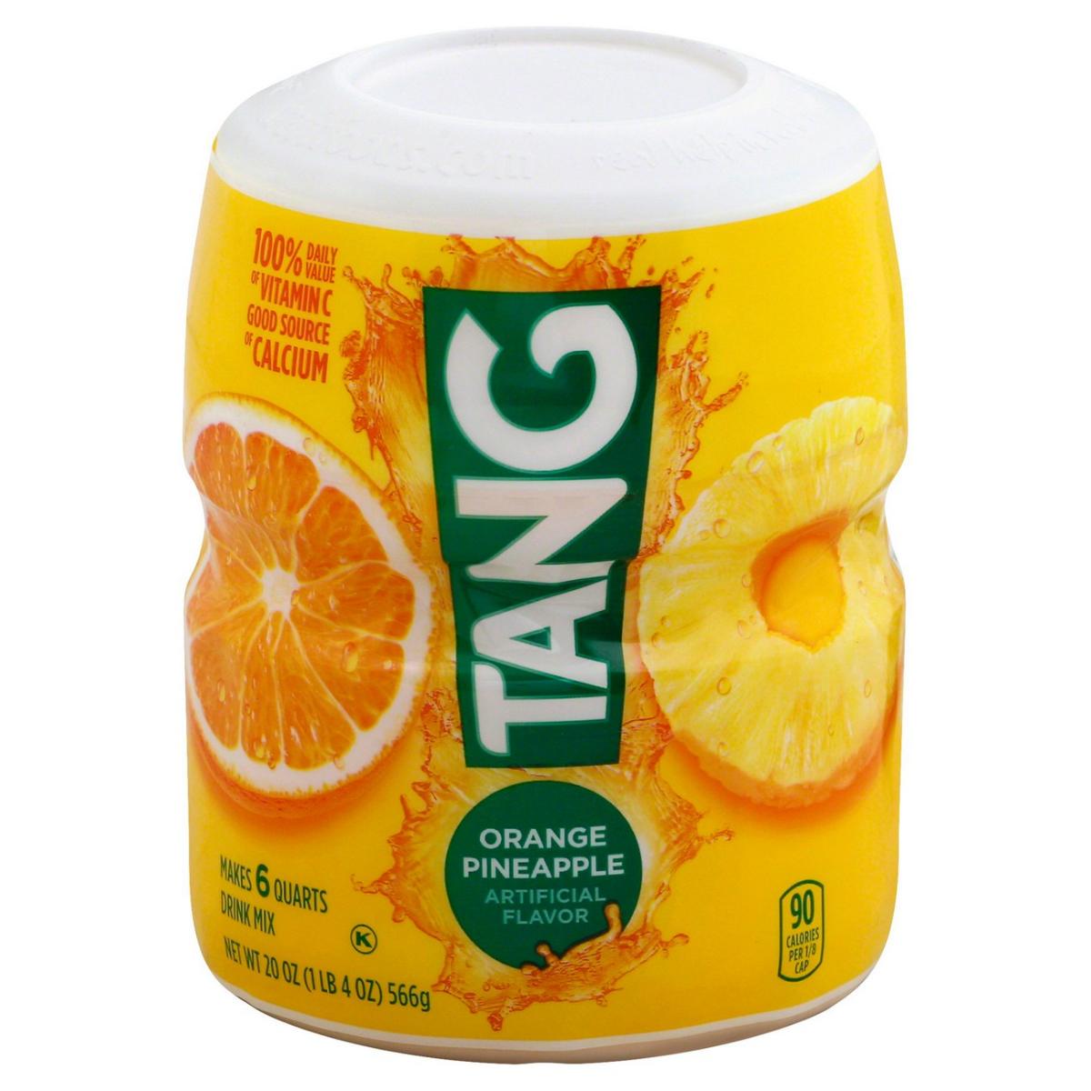 Tang Orange Pineapple Drink Mix is a great way to jump start your day. Made with a refreshingly fruity orange pineapple taste Tang has 100% of your Daily Value of Vitamin C and is a good source of calcium. This Tang Orange Pineapple Drink Mix comes in a resealable container to help lock in flavor and with an easy-measure lid for simple preparation. Each 20-ounce container makes 6 quarts of product so there is enough for the whole family to enjoy! To prepare simply pour powdered orange drink mix into plastic or glass pitcher add water stir and enjoy! Start your day off right with the refreshing taste of Tang!