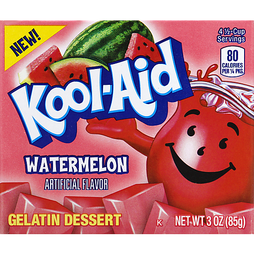 Kool-Aid Watermelon Gelatin Dessert. New! 4 1/2-cup servings. 80 calories per 1/4 pkg. Artificial flavor.